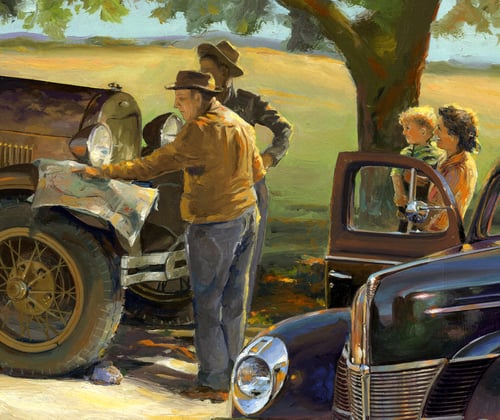 This painting was inspired buy the Model AA Truck and the beautiful 40 Ford depicted. They were both spotted at the Speedway Museum last summer at the Wheel Hub Live Cars and Coffee event.